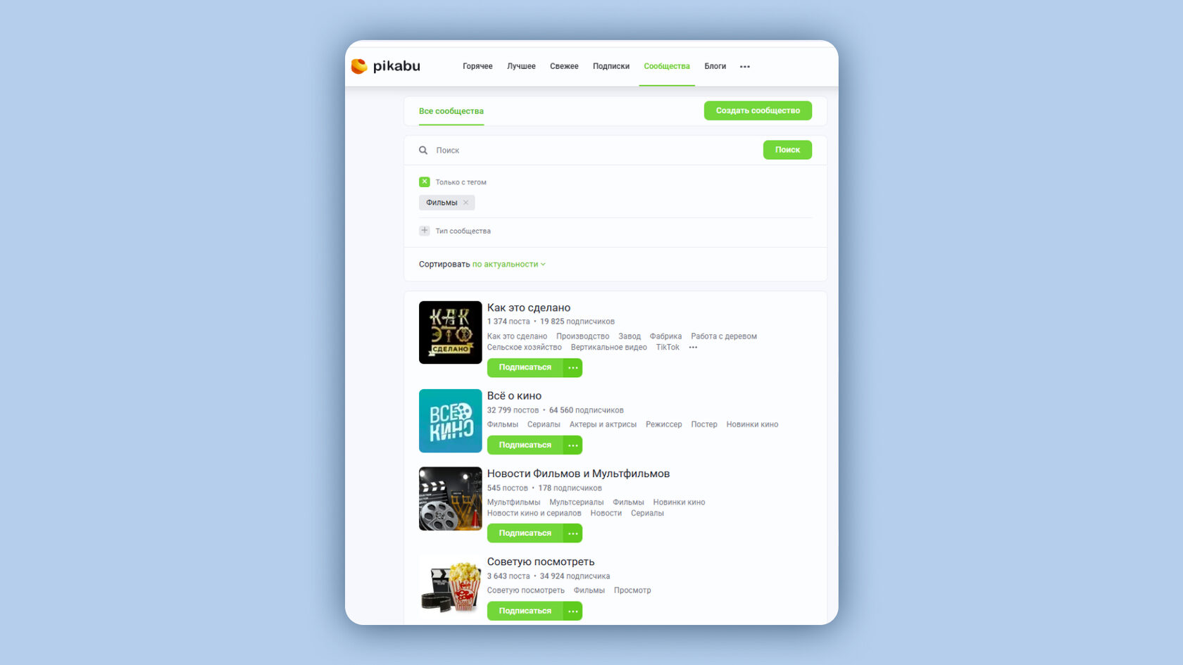 В этих сообществах люди обсуждают новинки, режиссеров и советует друг другу, что посмотреть. Это готовые темы для постов, обзоров и подборок