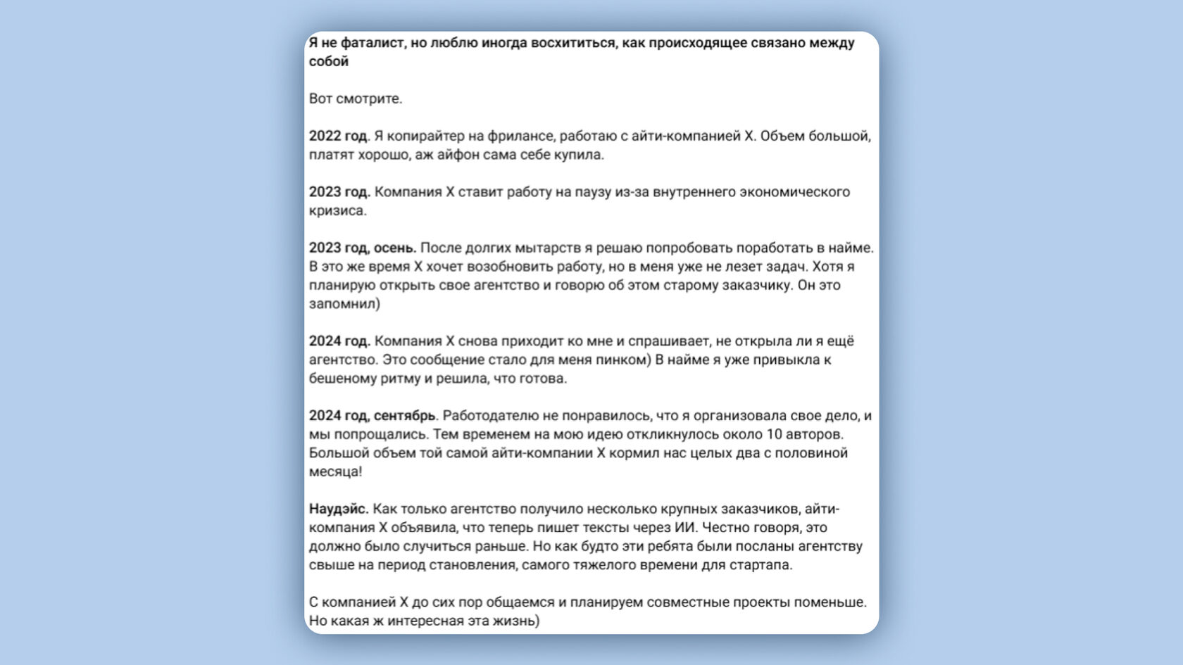 Пример: главред контент-агентства title в посте об истории создания своего дела использовала четкую структуру — год за годом