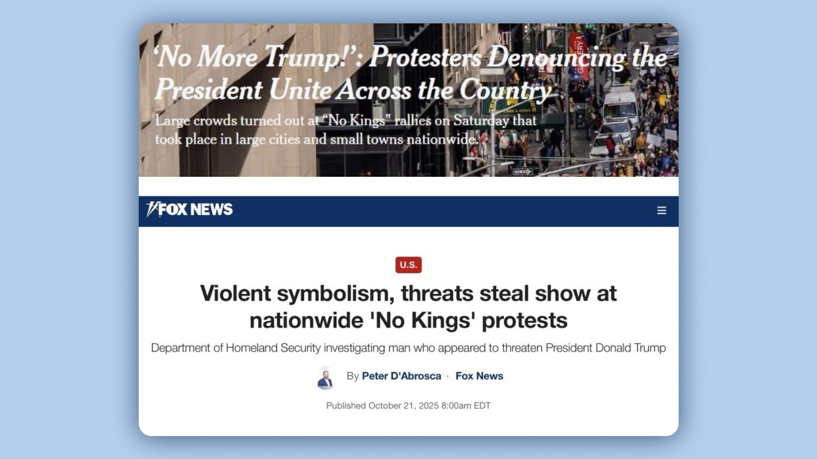 В октябре в США прошла волна протестов против политики действующего президента Дональда Трампа. Один факт — разная интерпретация. NY Times пишет, что протестующие выступили единым фронтом. Fox News рассказывает о символике насилия и угрозах президенту во время протестов