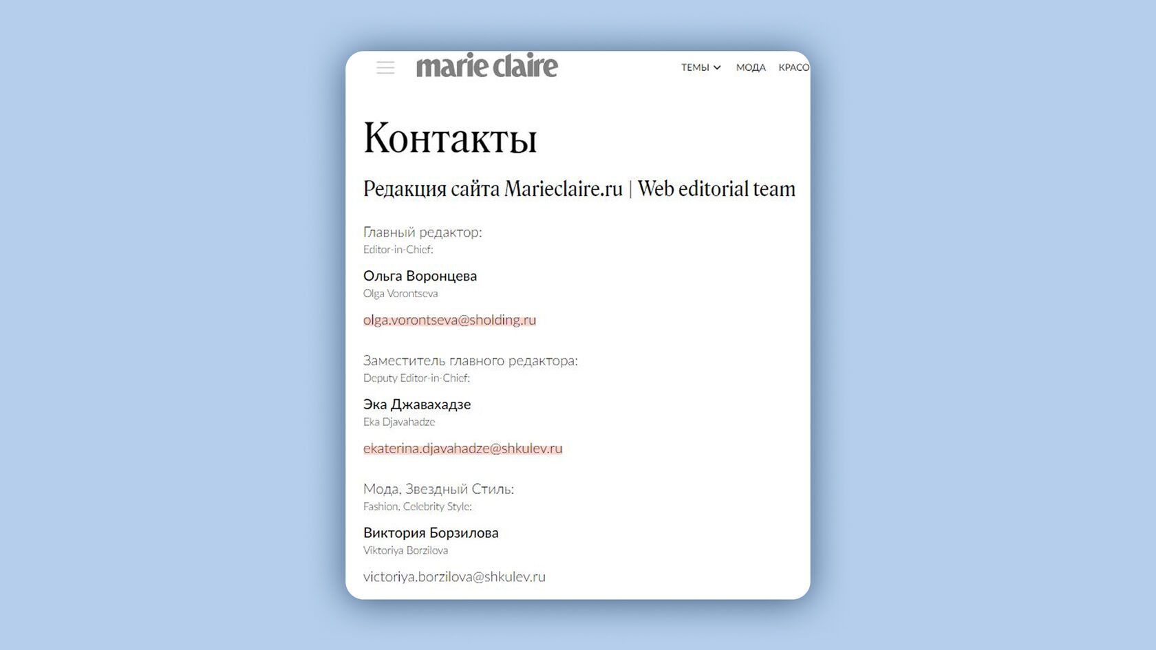 Как быстрее находить конкретного человека? Изучите сайт в разделах «Редколлегия», «Контакты» или «Команда». Посмотрите, кто является автором статей в нужной вам рубрике — его имя обычно указано в публикациях. Используйте профессиональные сети. Персонализированное обращение по имени повышает шанс, что ваше письмо не отправят в спам, а вашу публикацию статьи в СМИ рассмотрят серьезно.