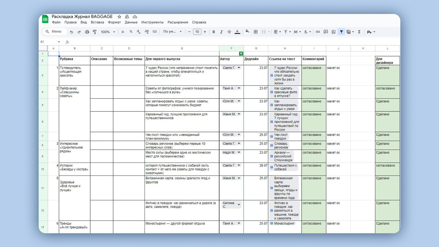 Так выглядел рабочий документ с темами статей, дедлайнами и авторами, доступ к которому имел заказчик