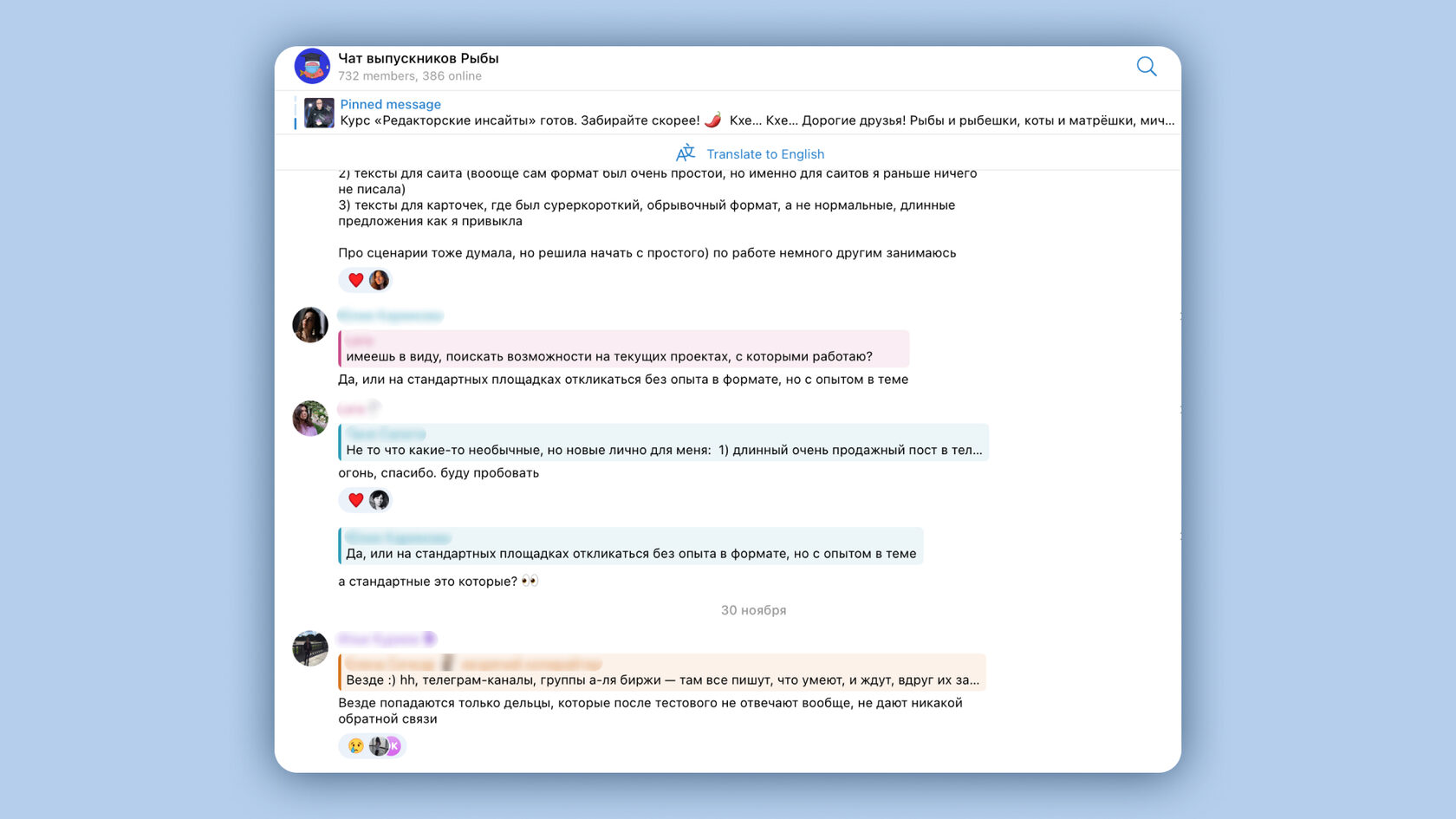 Закрытый чат выпускников курсов контент-агентства «Рыба»