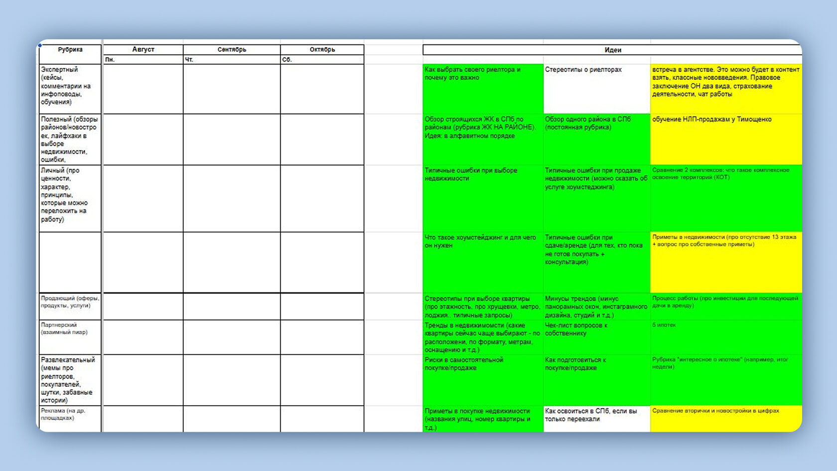 Один из вариантов заполнения контент-плана: в работе с блогом риелтора мы шли от темам к форматам, а не наоборот
