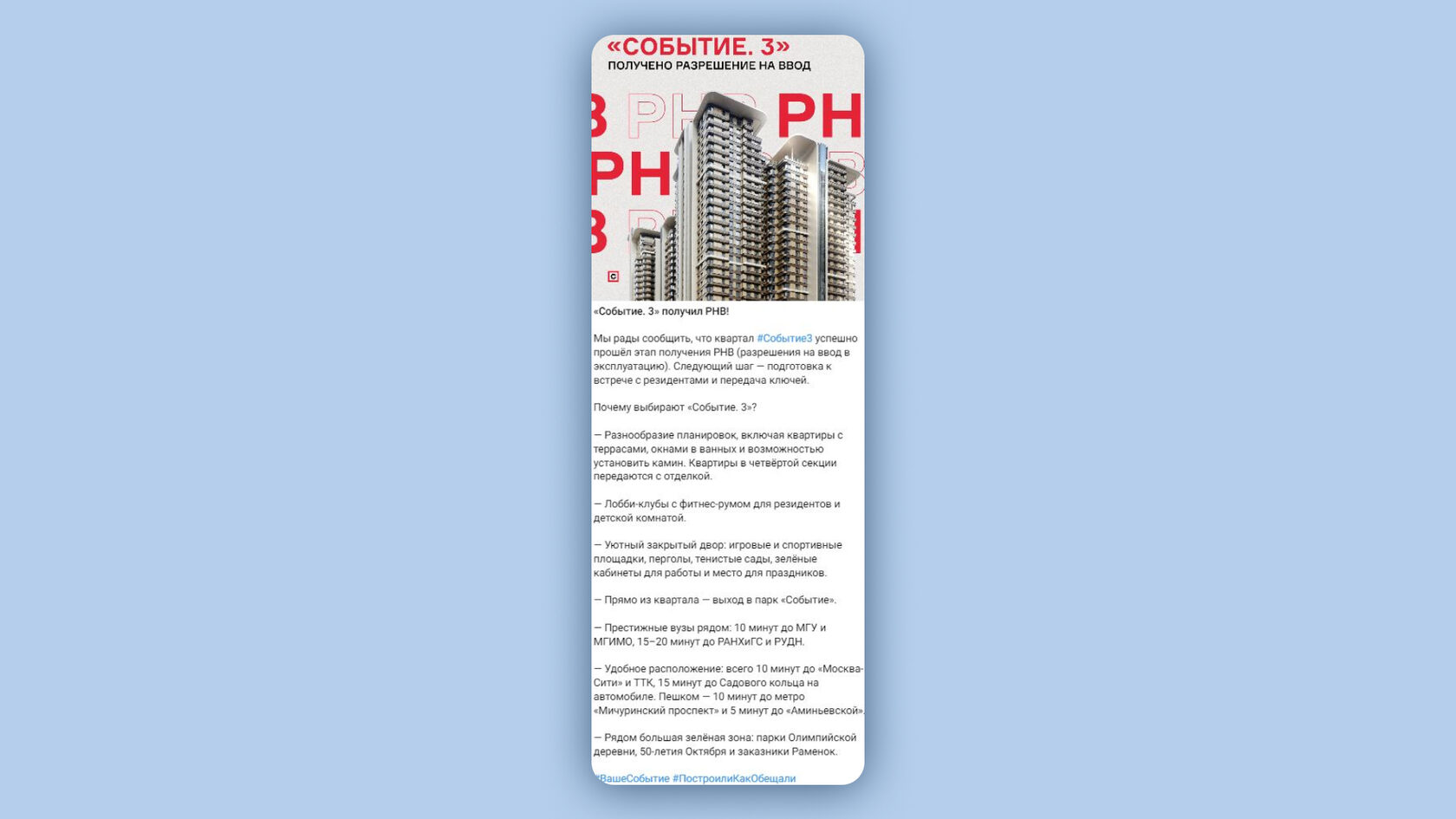 Репутационный пост в социальных сетях ЖК «Событие»