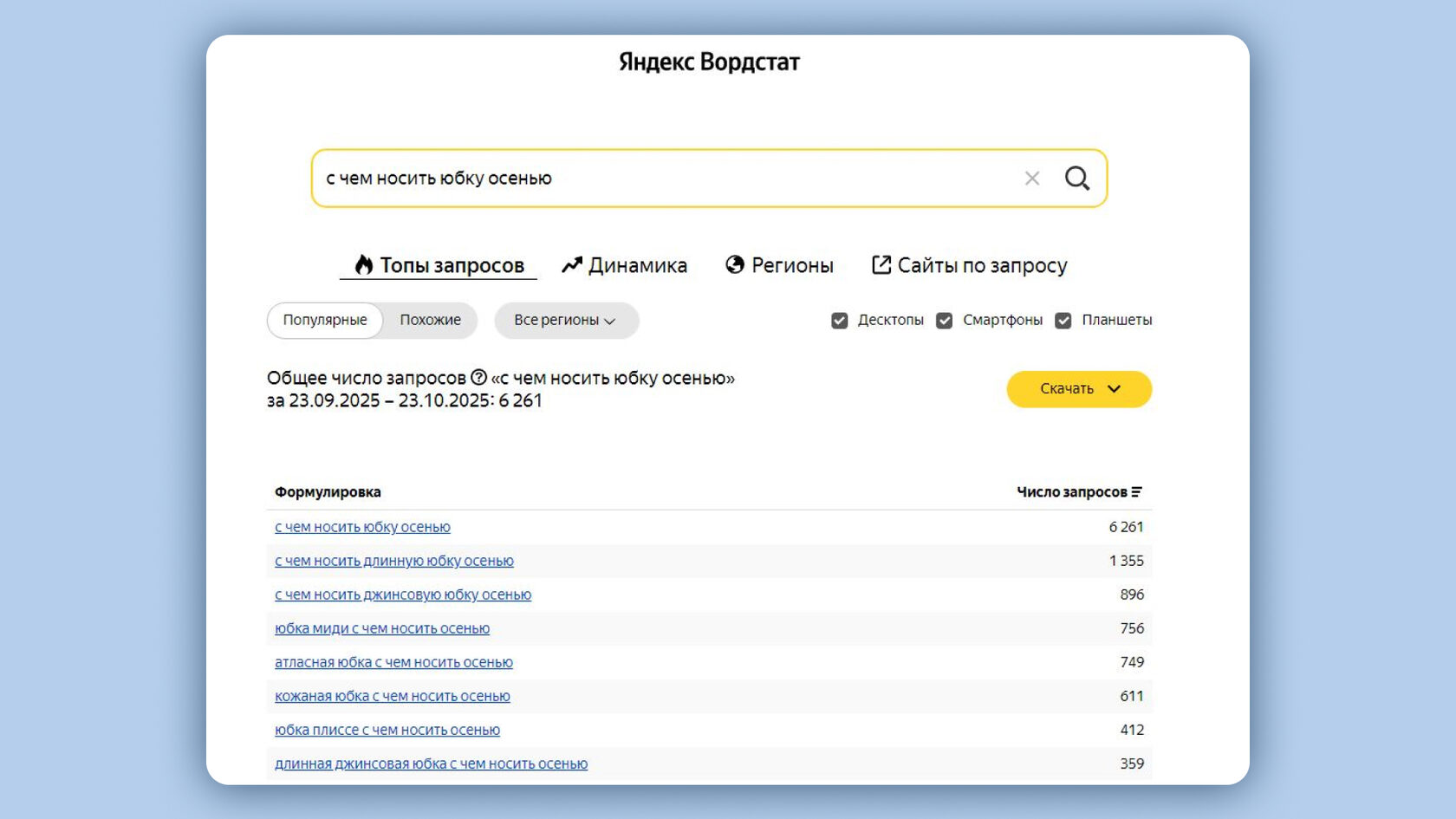 В Яндекс.Вордстат можно посмотреть, какие запросы чаще всего ищут люди, и на их основании создать контент
