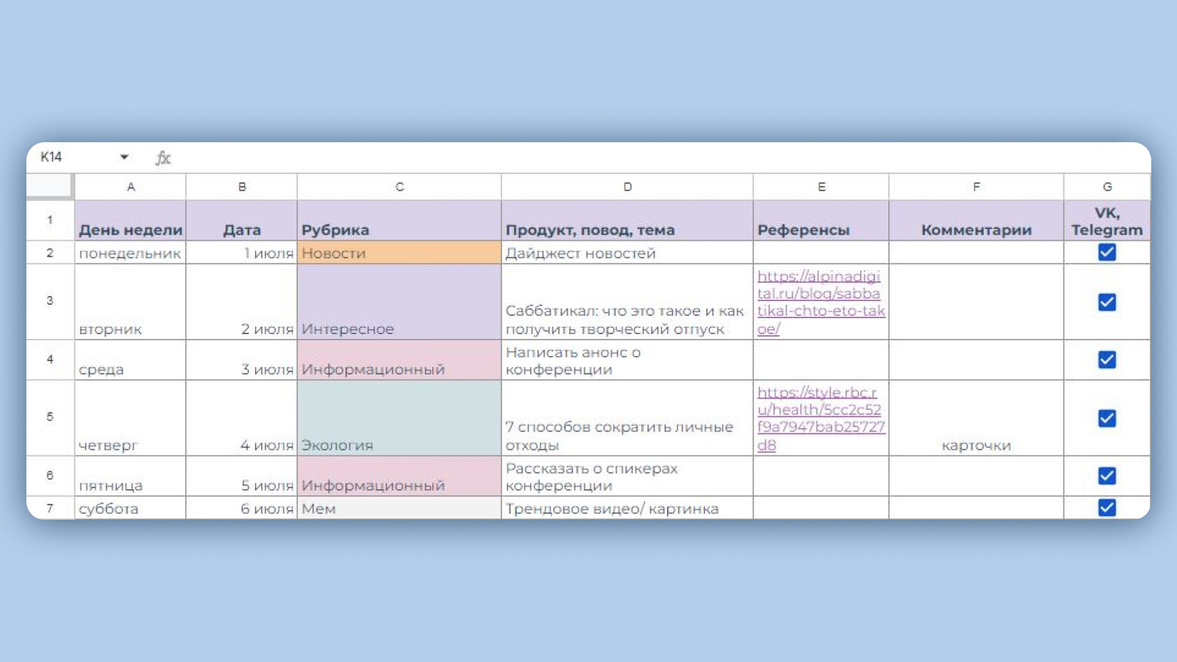 Подойдет начинающим специалистам, фрилансерам, блогерам и экспертам, которые ведут один-два канала. Такой формат позволяет вести контент-план даже в Google Таблицах и отслеживать публикации на нескольких площадках.